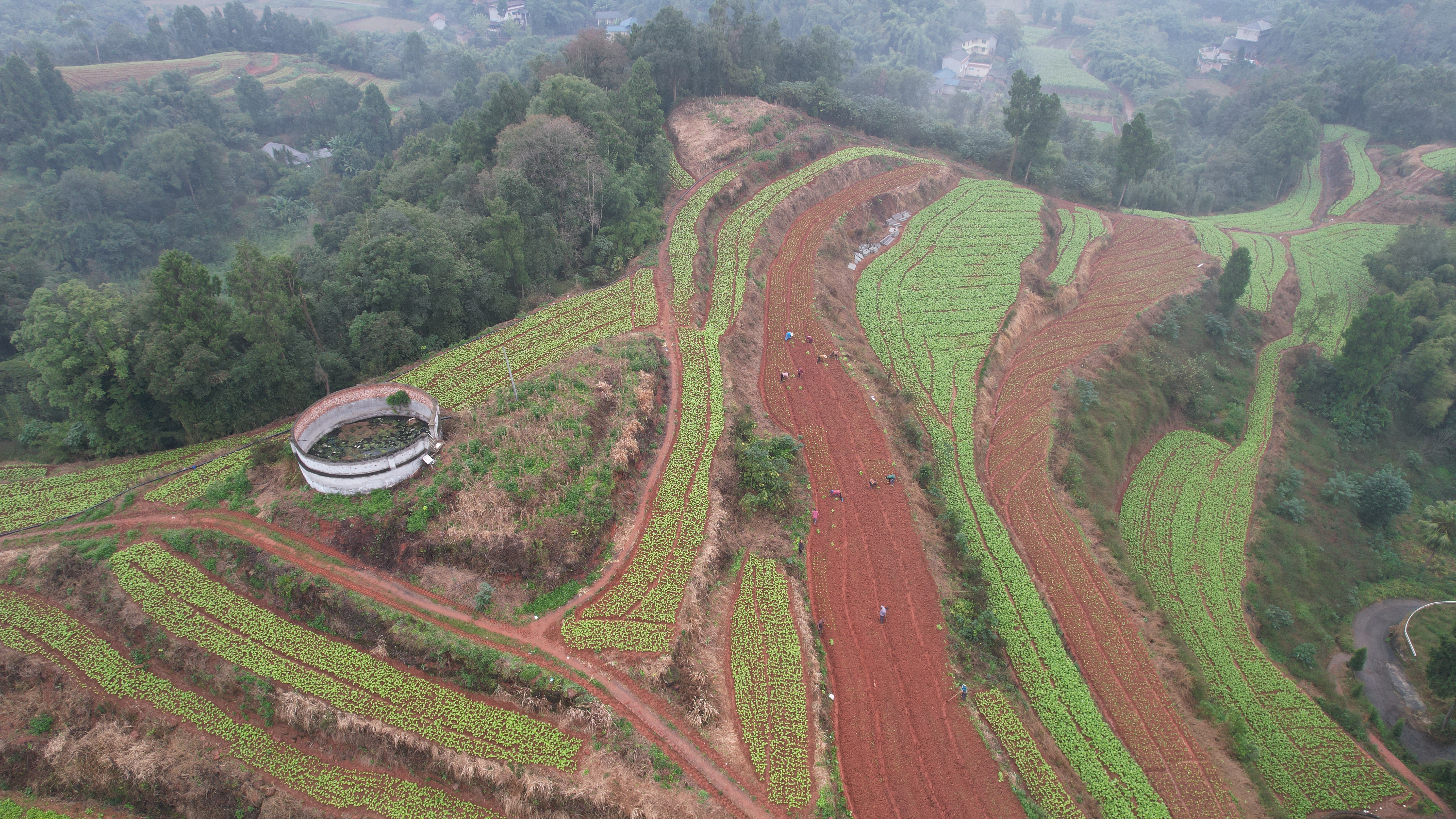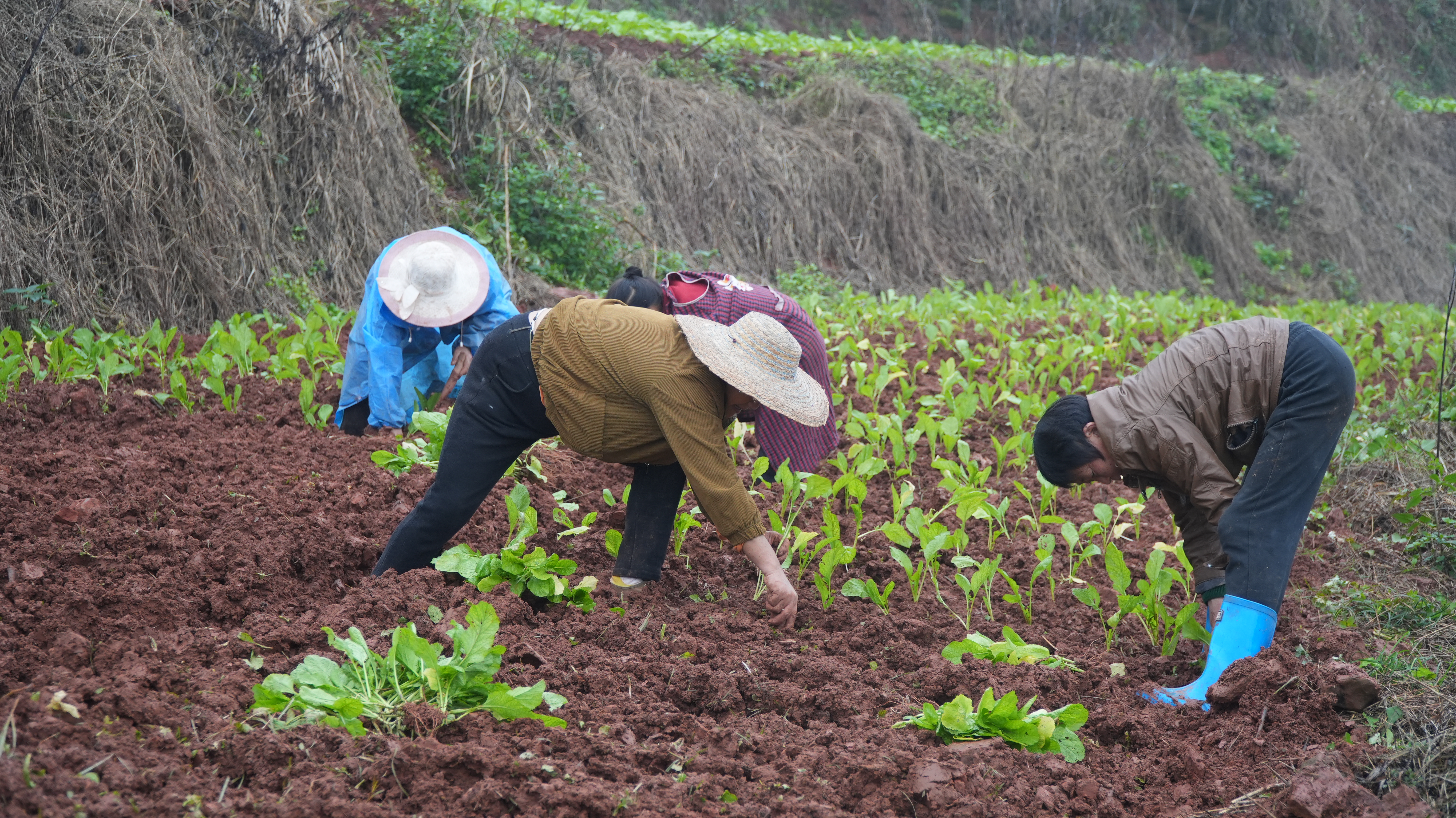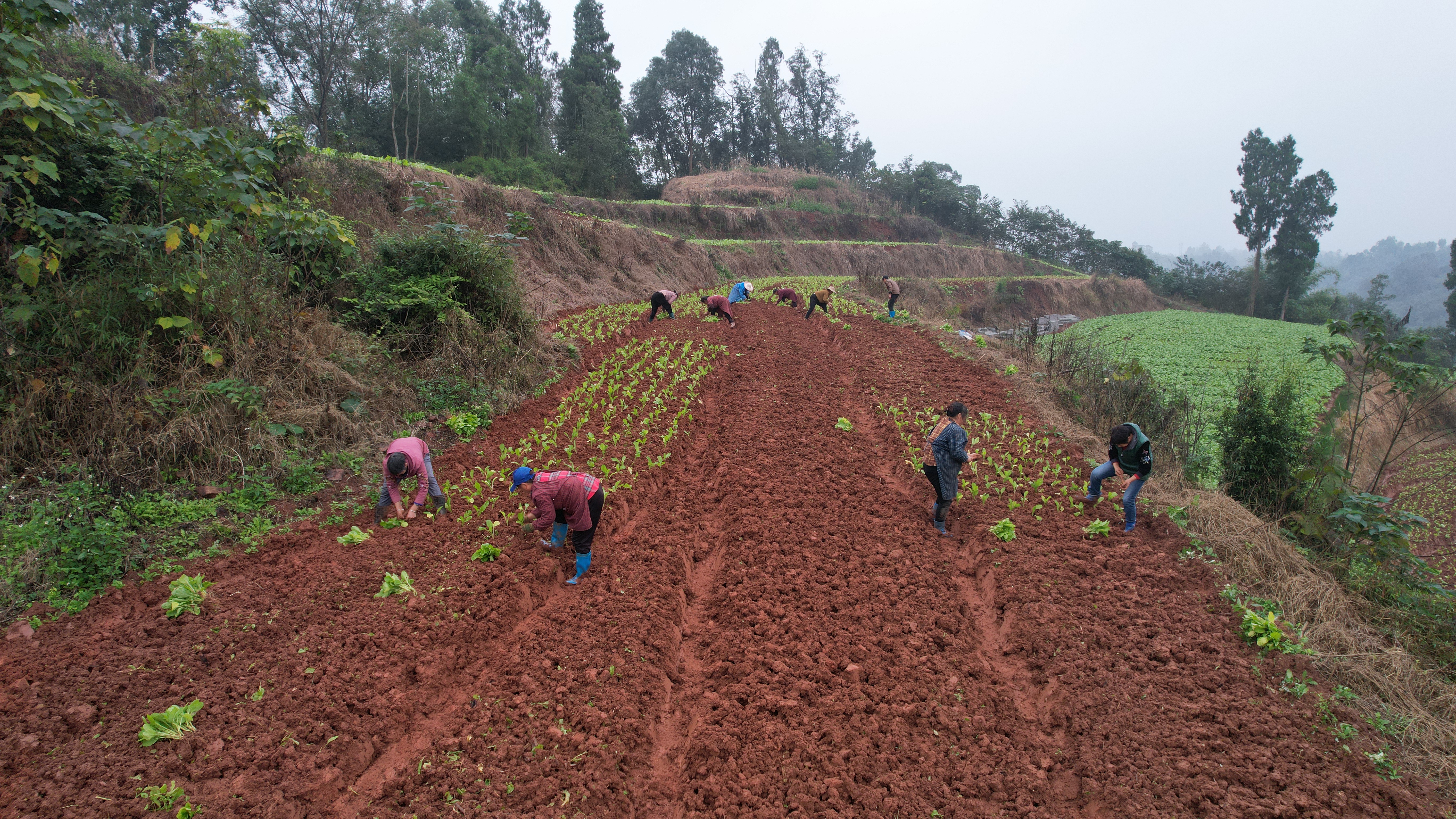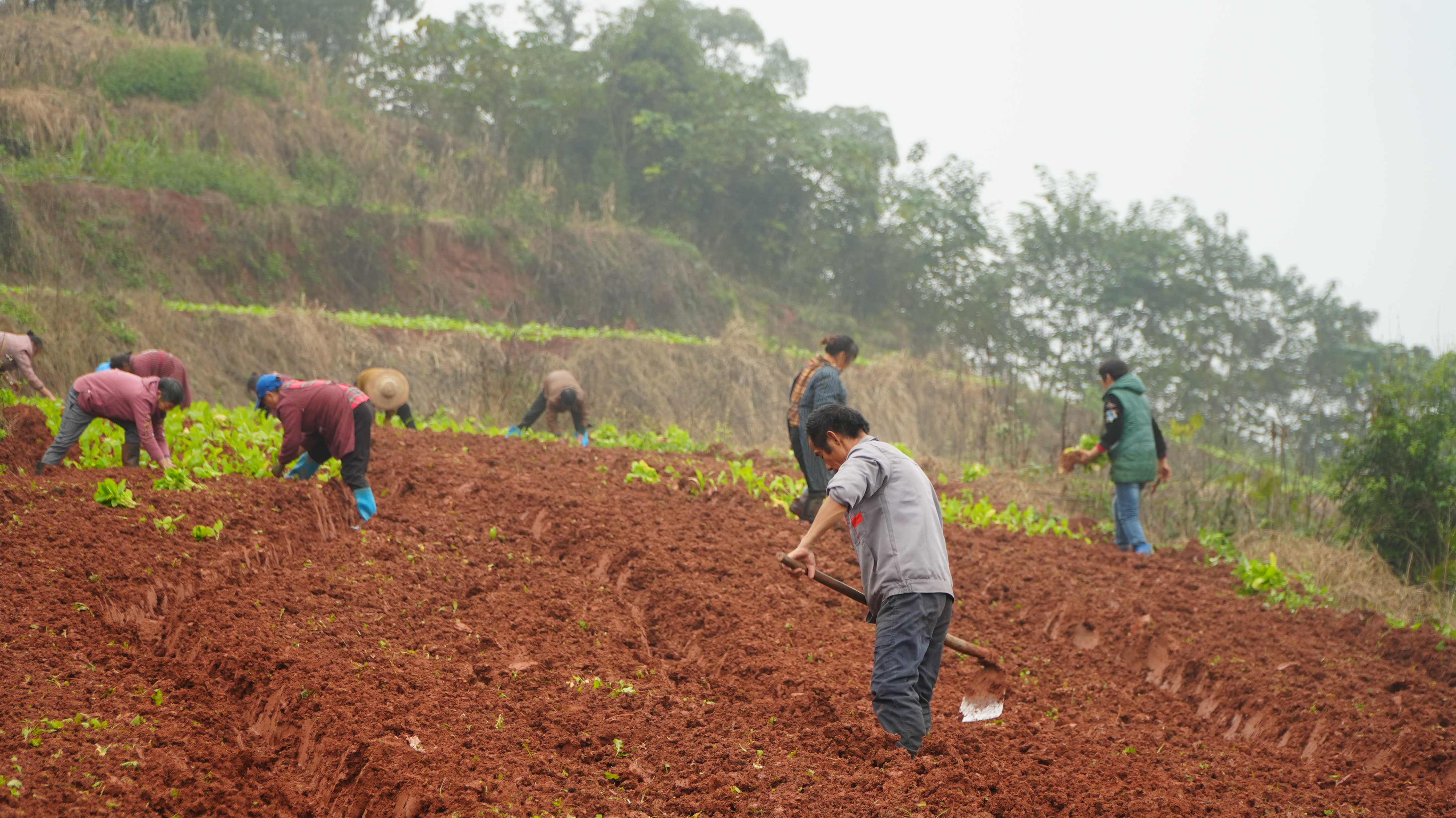 11月12日,雨后的空气裹挟着几分微凉,犍为县玉屏镇竹根村3组的村集体土地上,10多位村民正卷着衣袖、挽起裤脚,手持锄头小心翼翼地刨开湿润的泥土,将绿油油的榨菜幼苗稳稳栽入田中。