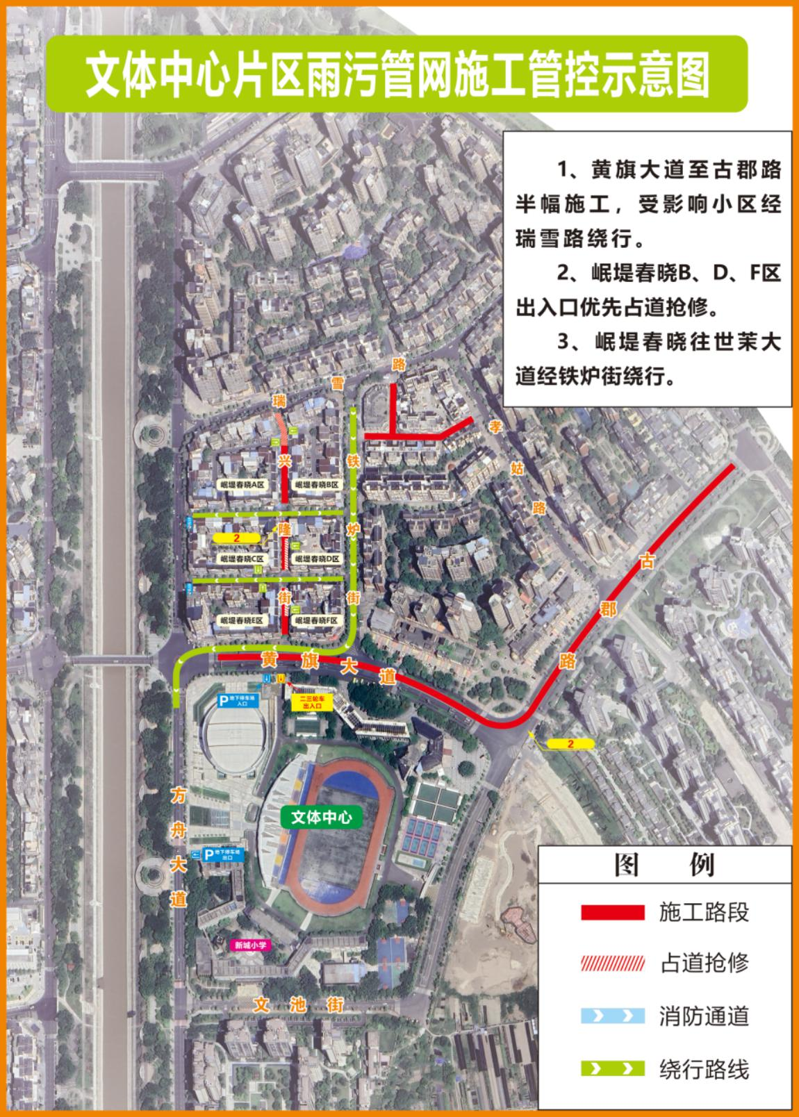 1.封闭施工区域:文池街、铁炉街,岷堤街全封闭施工,禁止所有车辆通行,保留人行道。古郡路下半段(文池街路口至黄旗大道路口)半幅封闭施工,仅消防车辆通行,保留人行道。
