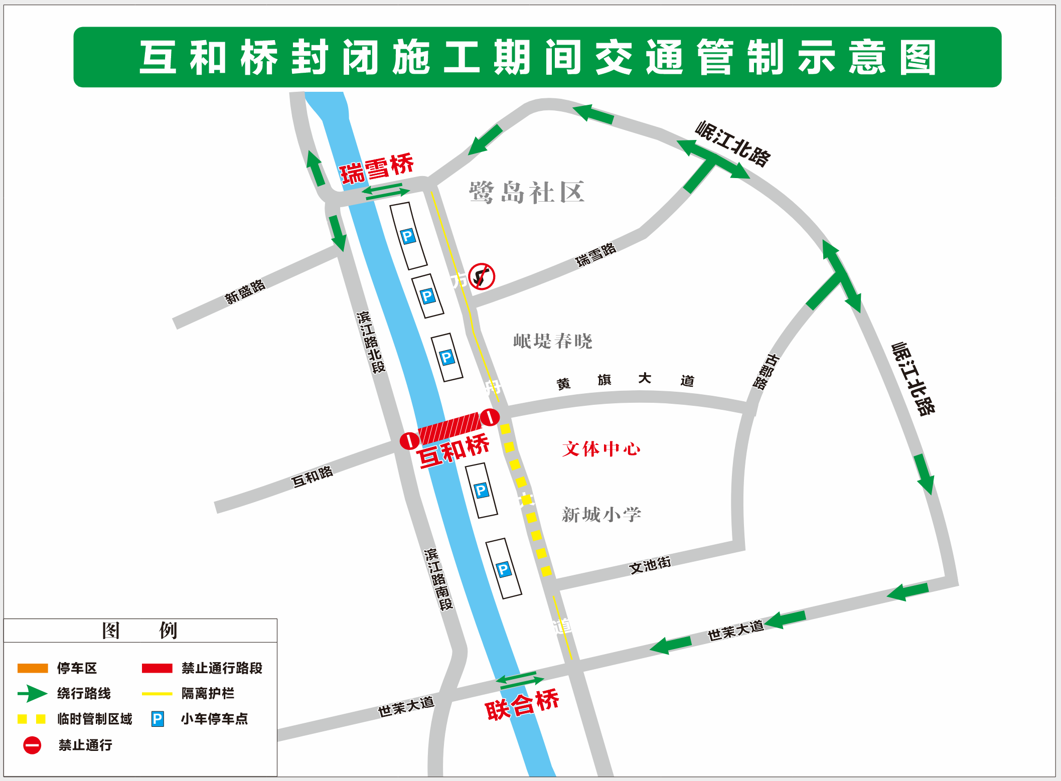 1、全封闭路段。互和桥禁止所有车辆和行人通行。