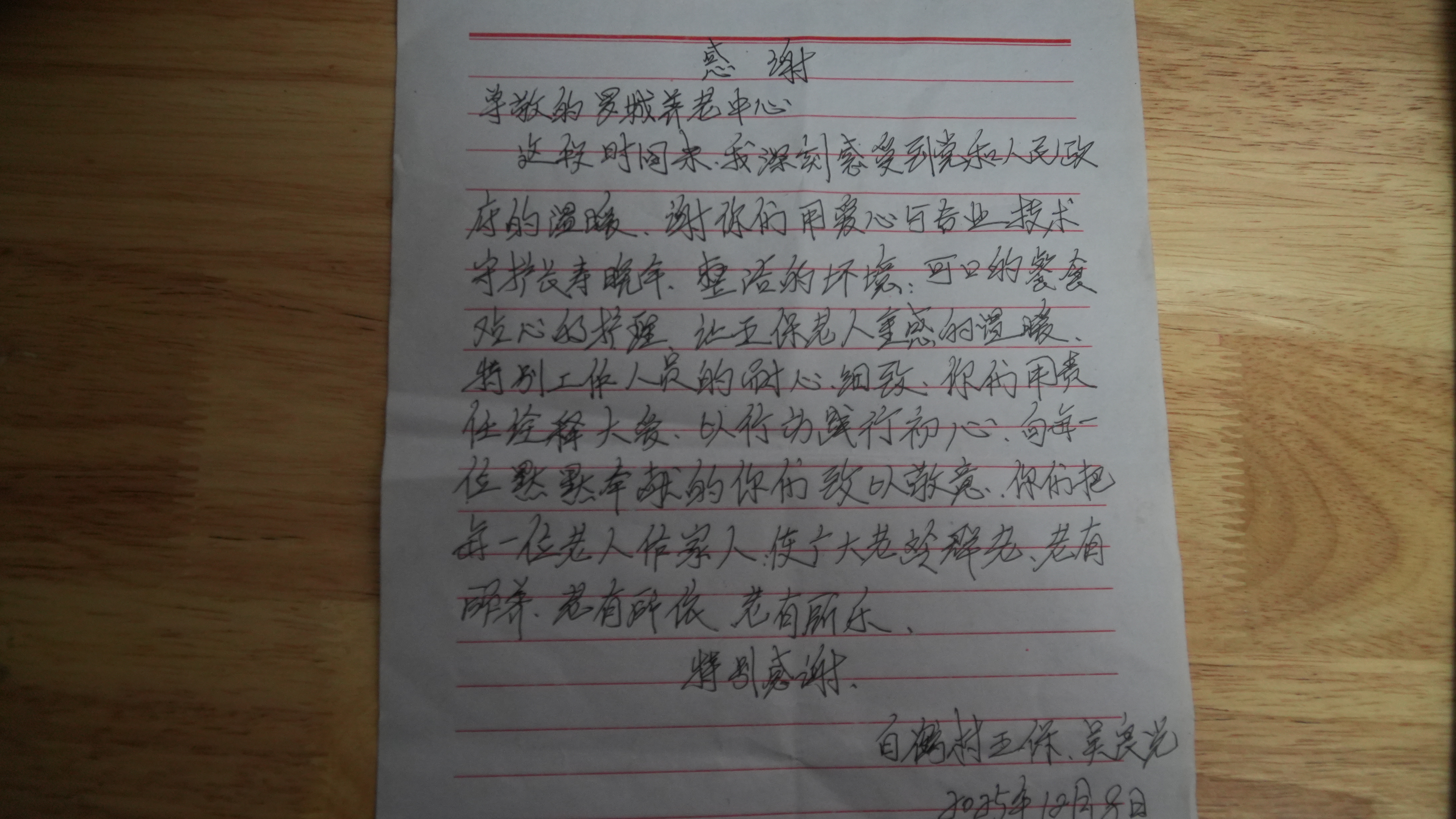 可口的热饭热菜、细致入微的照料、温馨和睦的氛围,让综合体接连收到了一封封情真意切的感谢信,字里行间承载的,是老人们的认可与信赖,更是养老服务绽放的温暖光芒。