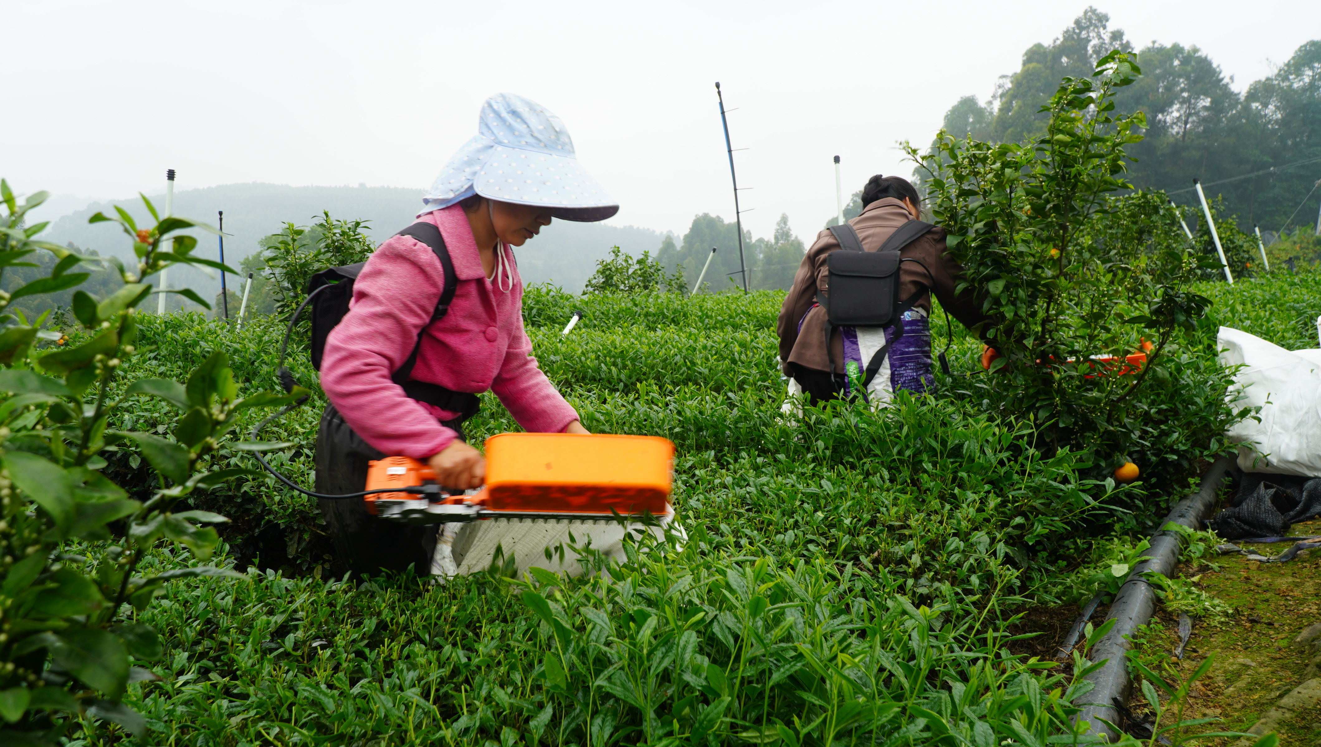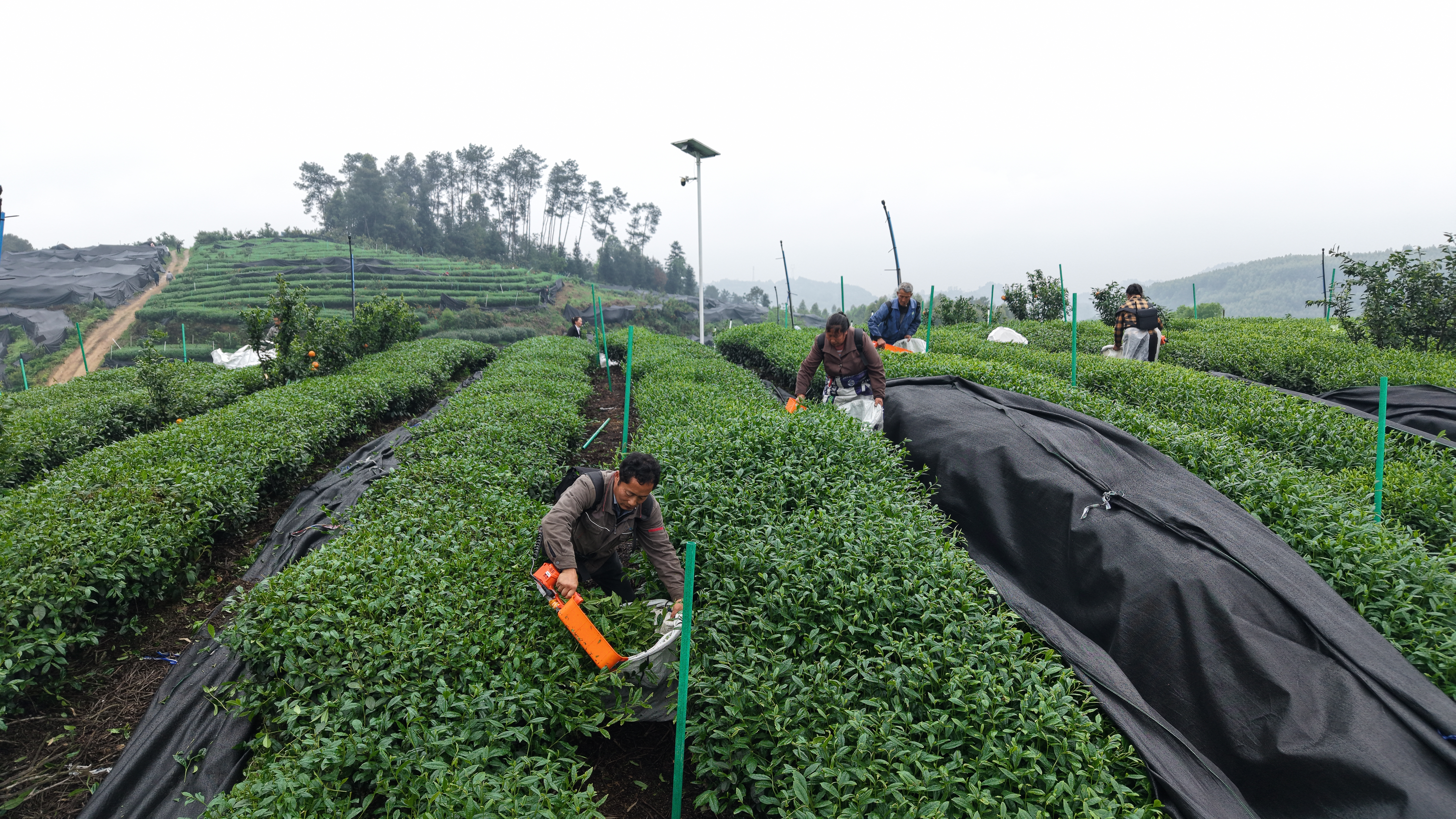 近日,位于犍为县石溪镇白家村4组的乐山市容禾农业有限公司欧标抹茶基地里,层层茶垄连绵起伏,鲜嫩的抹茶芽叶长势喜人,静待采摘。数十位村民手持电动采茶机穿梭其间,轻轻一扫,嫩芽便簌簌落入袋中,奏响春日丰收序曲。